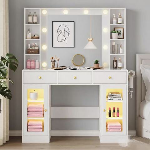 स्मार्ट सफेद मेकअप वैनिटी 3-रंग डिम्बल मिरर बड़ा आधुनिक वैनिटी टेबल 4 दराज होटल के लिए भंडारण शेल्फ