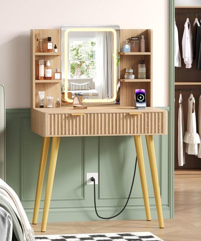 आधुनिक 3-मोड 4-ओपन स्टोरेज वैनिटी डेस्क मिरर छोटे प्राकृतिक ओक मेकअप फर्नीचर 2 दराज 3 प्रकाश मोड बेडरूम फर्नीचर