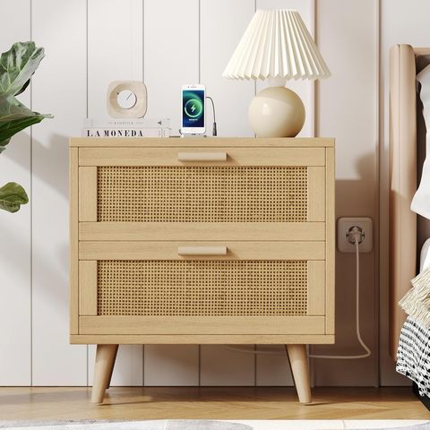 आधुनिक ठोस लकड़ी नाइट स्टैंड चौड़ा रतन चार्जिंग स्टेशन 3 बड़े दराज स्मार्ट सुविधाएँ प्राकृतिक बेडरूम/डॉर्म/प्रवेश द्वार कैबिनेट